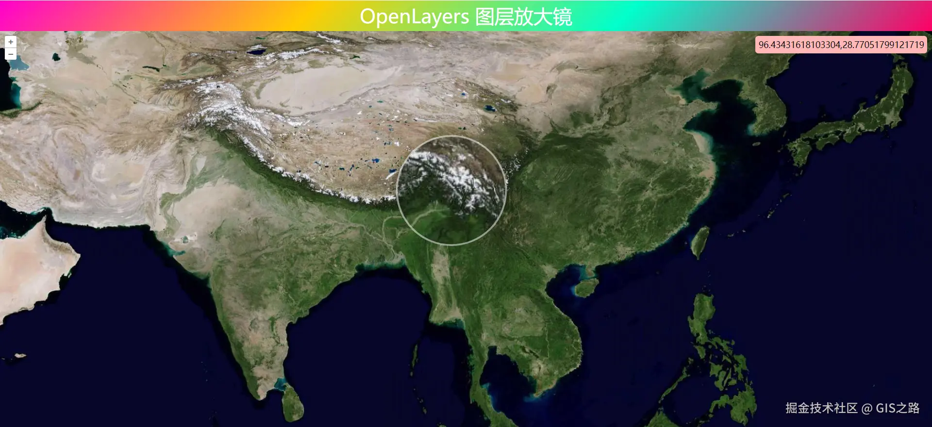 地图放大镜实现请参考:OpenLayers 地图放大镜地图放大镜效果,可以通过键盘上下箭头调整放大镜大小。