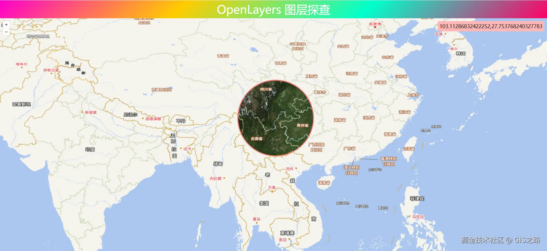 图层探查实现请参考:OpenLayers 图层探查图层探查效果,可以通过键盘上下箭头调整探查半径大小。