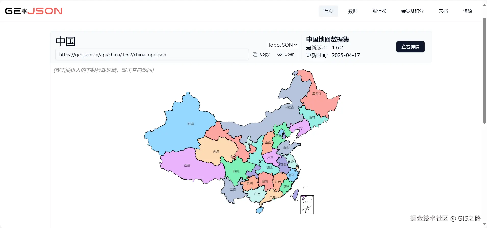 在这里你可以预览全国省、市、区县的GeoJSON数据并支持在线访问和下载,网站还提供了台湾省地图数据集和天地图-国家标准矢量地图数据集以及九断线和黄页岛领海基线数据文件下载。