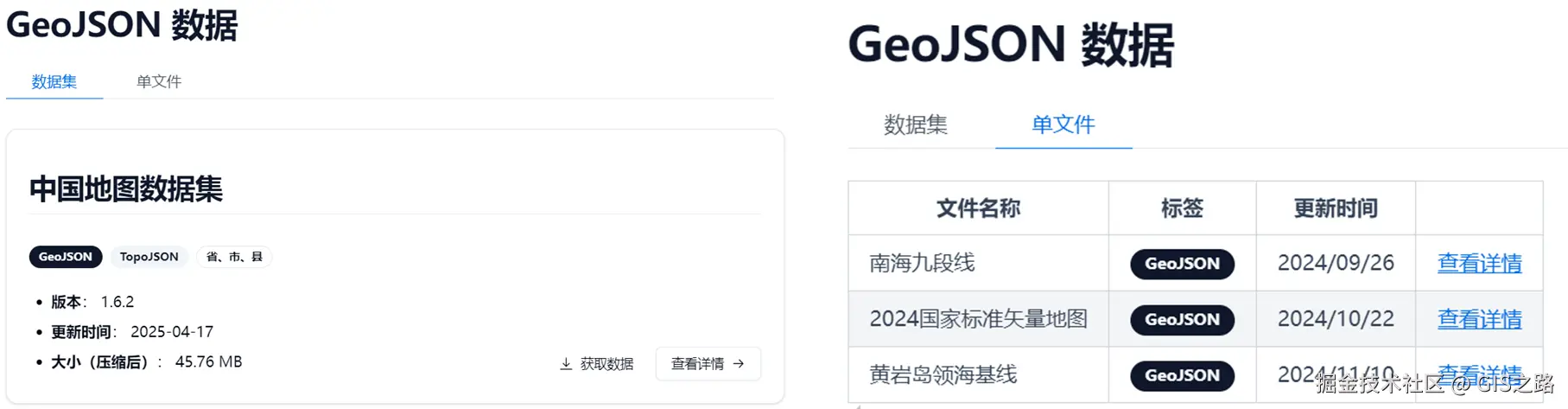 数据页面提供GeoJSON数据集和数据文件预览和下载。