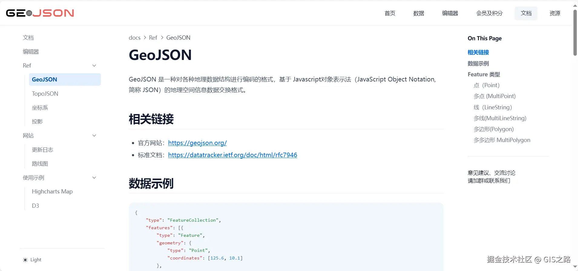 文档页面是对网站功能以及数据功能的介绍。在这里可以查看GeoJSON和TopoJSON数据结构类型、数据坐标系类型介绍、网站日志和一些示例展示。