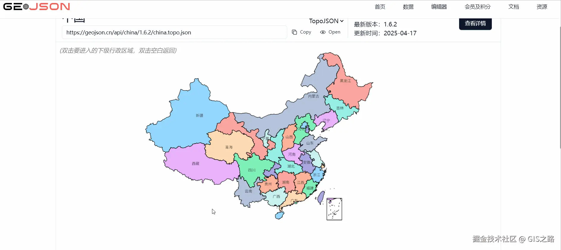 首页如下图,在此页面可以预览GeoJSON数据和查看在线数据链接。在此页面双击省级行政区域,可查看州、市级行政区;再次双击目标州、市行政区域,可查看县区级行政区域;双击空白处返回上一级行政单位。