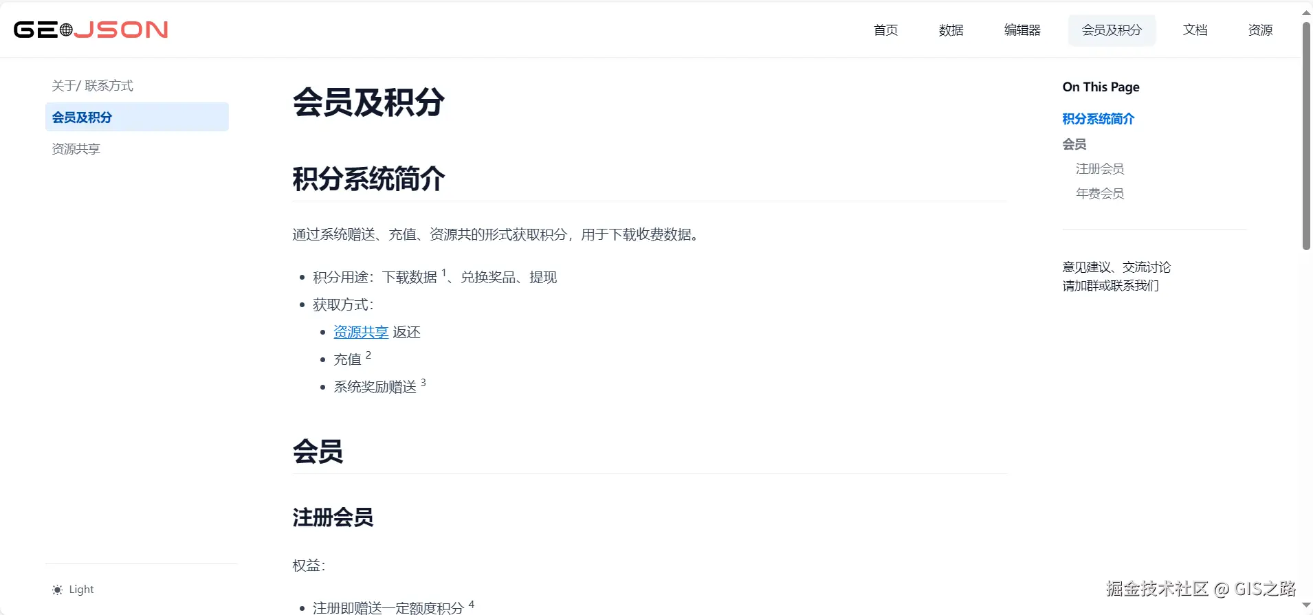 网站菜单主要由六部分组成:首页、数据、编辑器、会员及积分、文档和资源。