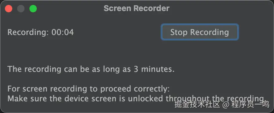 进入到录屏环节后,你可以发现,你的真机也开启了录屏,它是调用了你真机的录屏功能,你可以点击Stop Recording进行停止录屏。