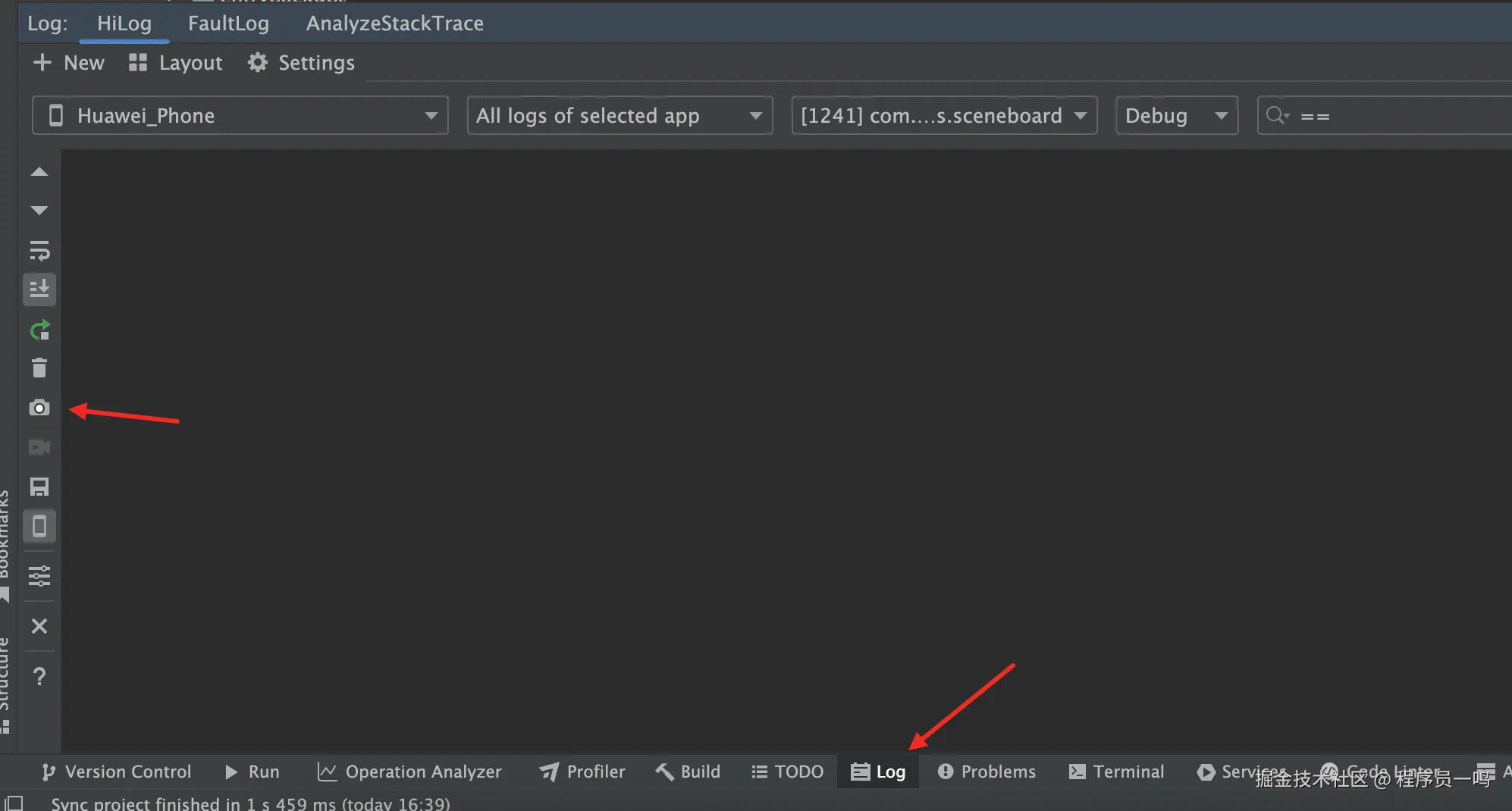 打开底部的log日志控制台,在左侧有一个相机图标,这个就是截图功能。