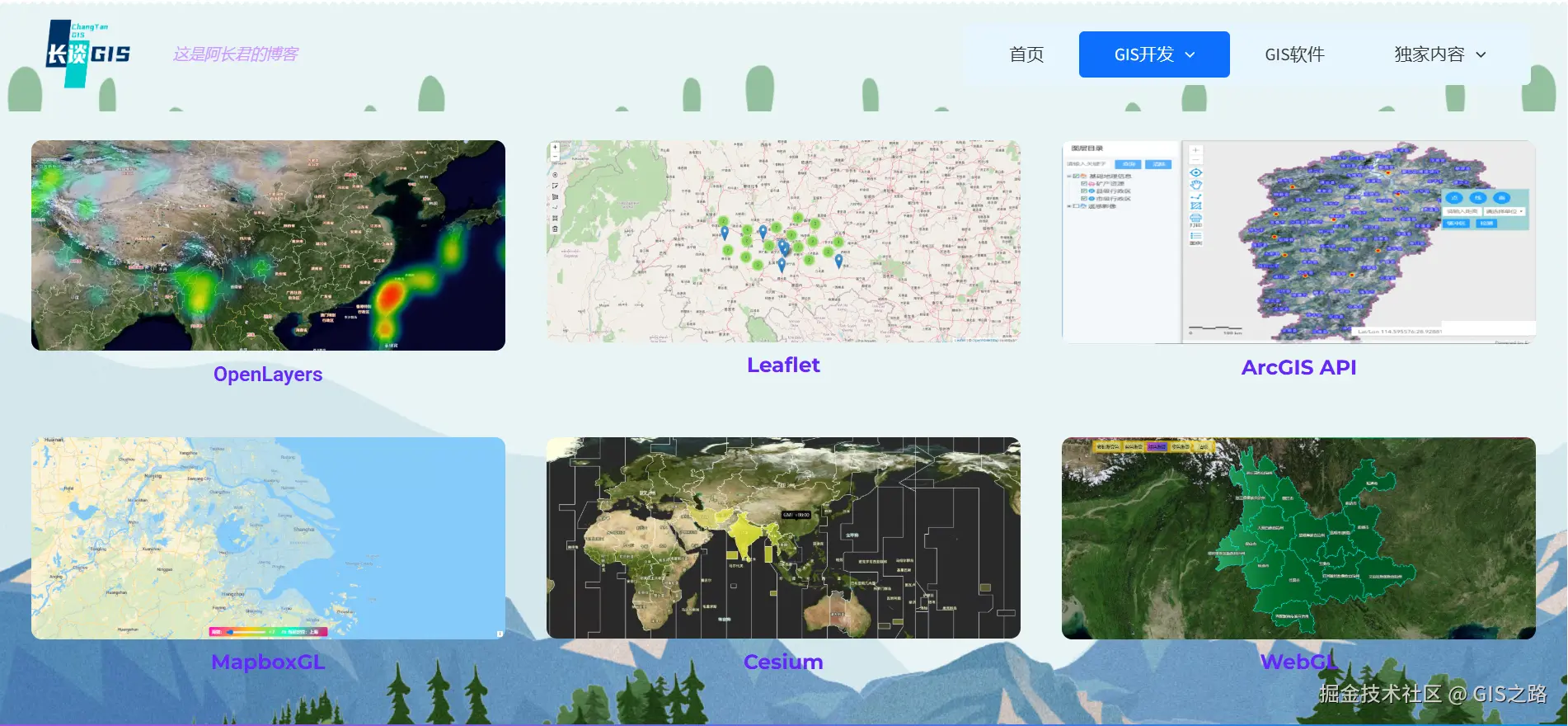GIS开发部分目前包含一个下拉菜单【OpenLayers】,主要用于介绍WebGIS类开发知识,在GIS开发菜单页面列出了包括OpenLayers、Leaflet、Cesium等前端JS地图库模块,点击图片可进入对应模块内容。之前想着是不是将名称改为GIS开发专题会不会更好,但是换了几个版本,还是给换回来了。