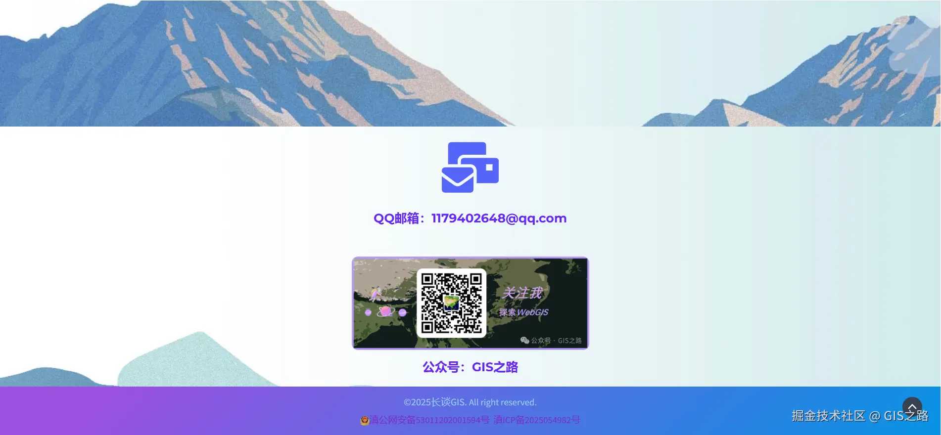 首页非常简洁,第一页由一行文本和一个按钮组成。用“欢迎来到GIS乐园”这行文本标明这是一个有关GIS内容的网站,下方按钮”联系作者“跳转到第二页,有我的联系方式,如有需要,可以给我发消息。