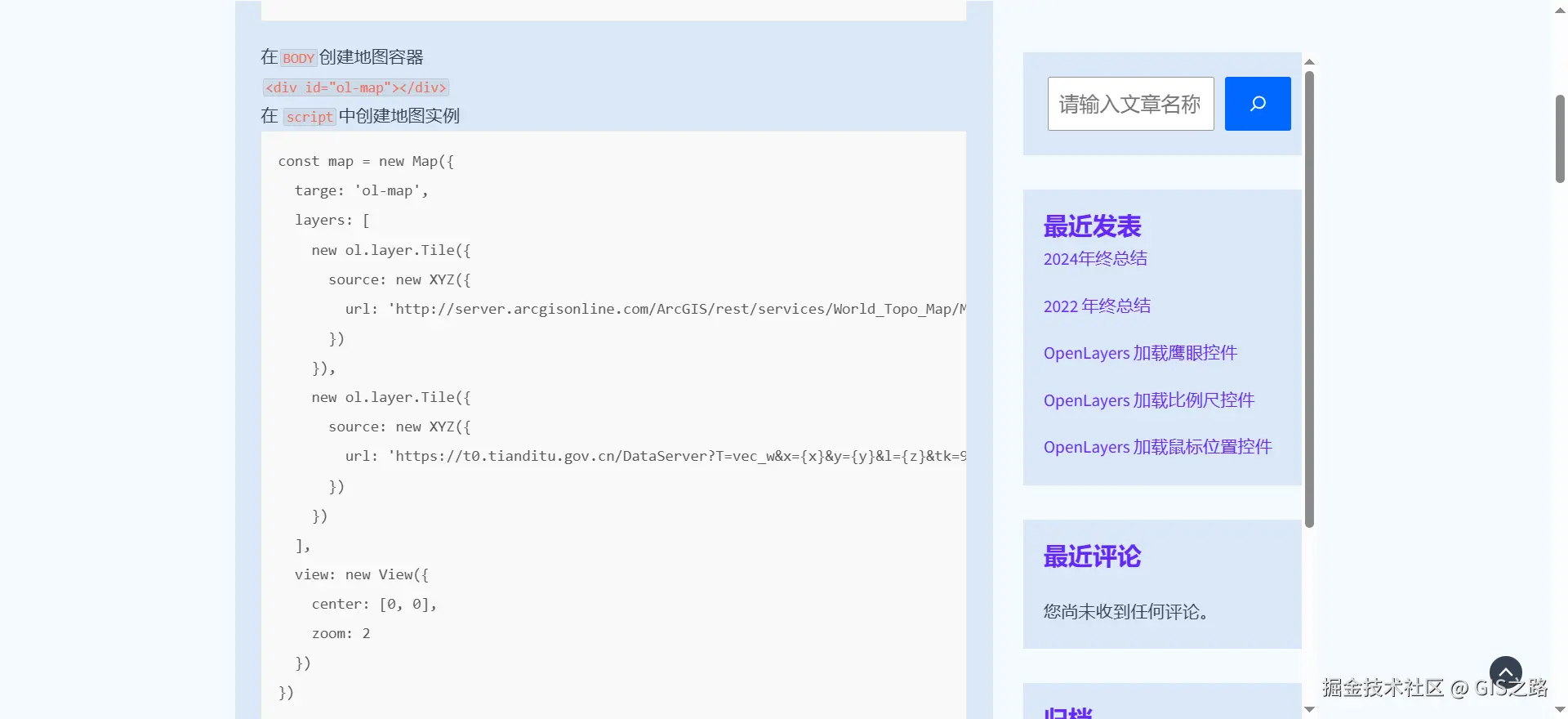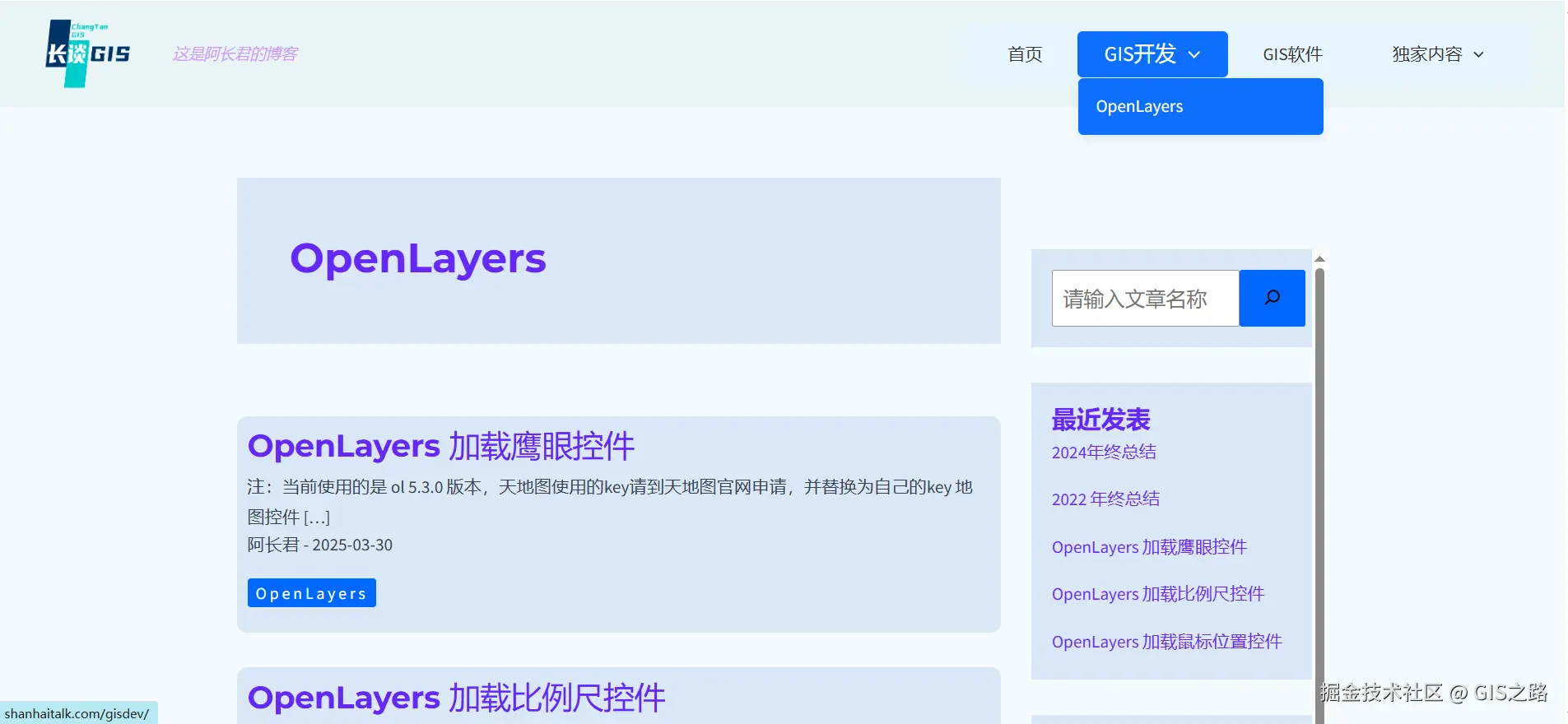 进入开发专题后,入OpenLayers专题所所示,中部左侧部分由文章列表组成,可点击标题进入文章页面,右侧为侧边栏工具,可以搜索和查看分类文章。