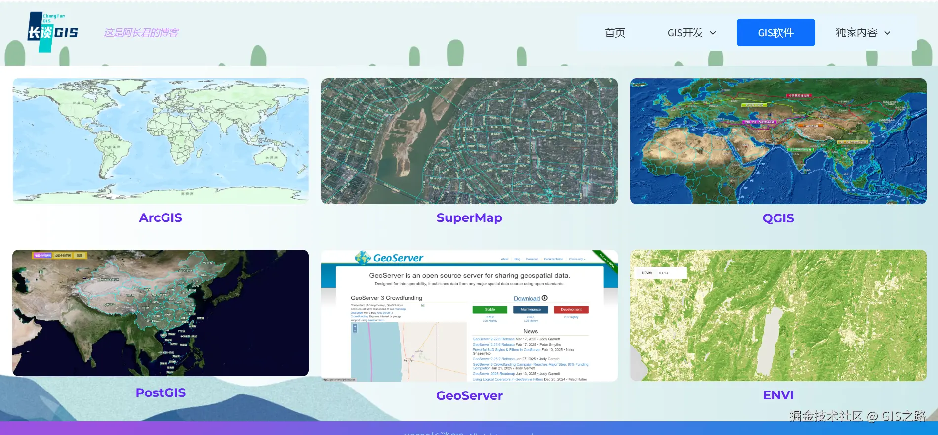 GIS软件部分与GIS开发类似,目前未设置下拉菜单。主要用于介绍GIS软件操作类知识,在GIS软件菜单页面列出了包括ArcGIS、SuperMap、QGIS等常用GIS软件模块,点击图片可进入对应模块内容。