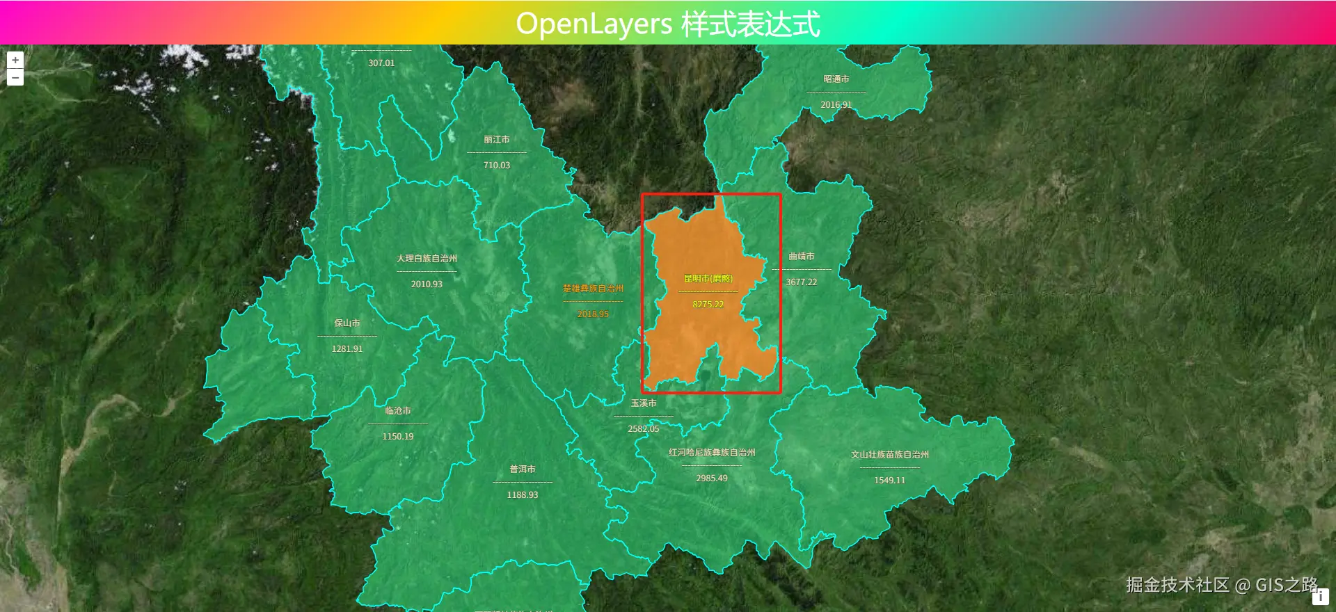 与case结合,使用any运算符,当行政区名称等于昆明市(磨憨)或者楚雄彝族自治州时进行渲染。