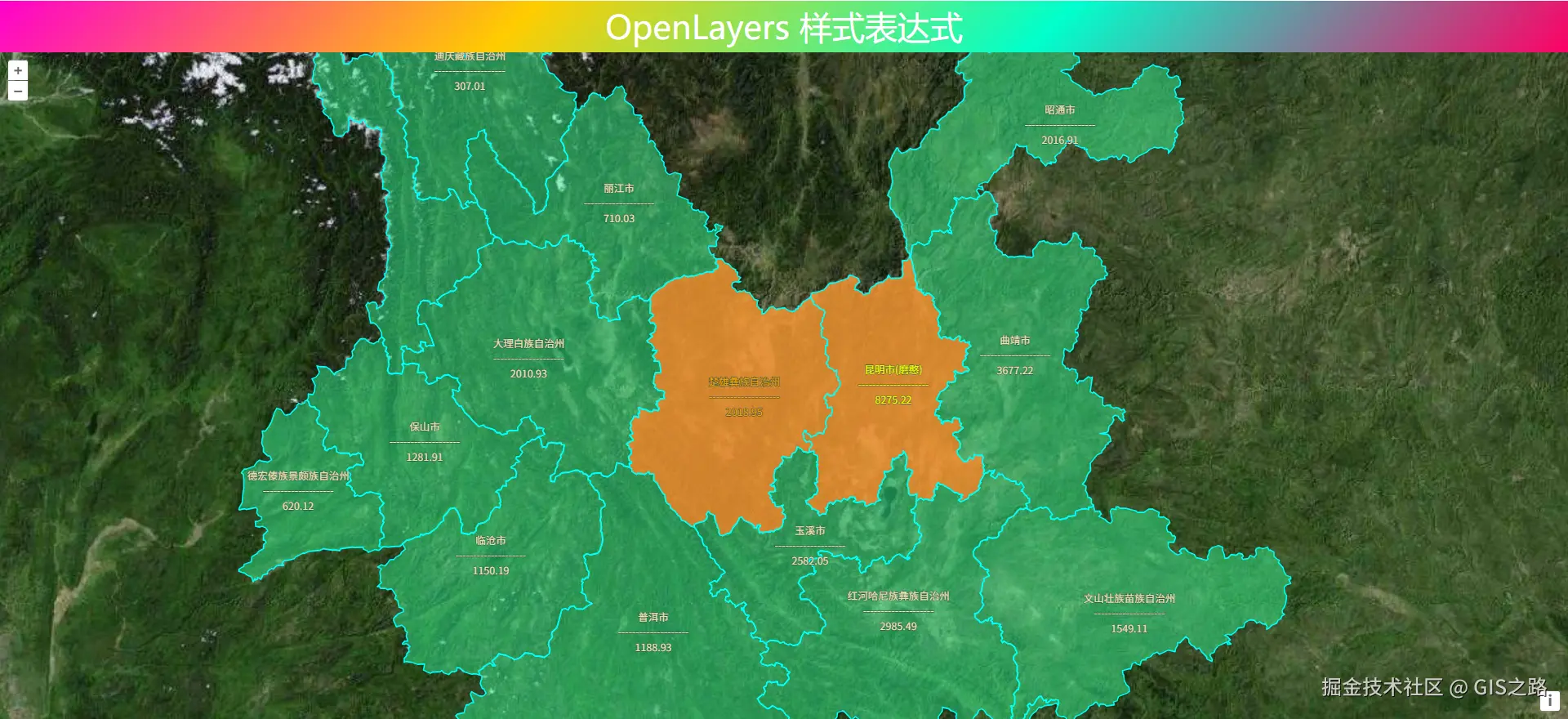 "text-fill-color": ["match", ["get", "name"], "昆明市(磨憨)", "#FFFF00", "楚雄彝族自治州", "#FFA500", "#EEE8AA"],
