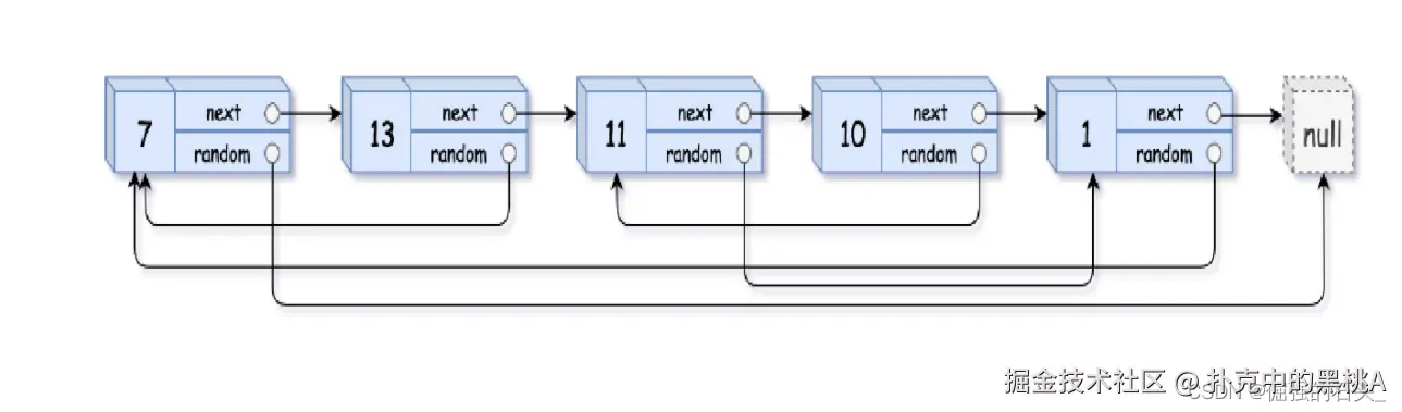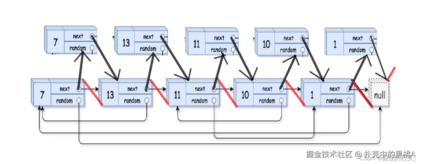 - 完成节点的随机指针拷贝——原节点的随机指针指向哪里,拷贝节点就指向对应节点的下一个节点(这一部分是这条思路能实现的关键)