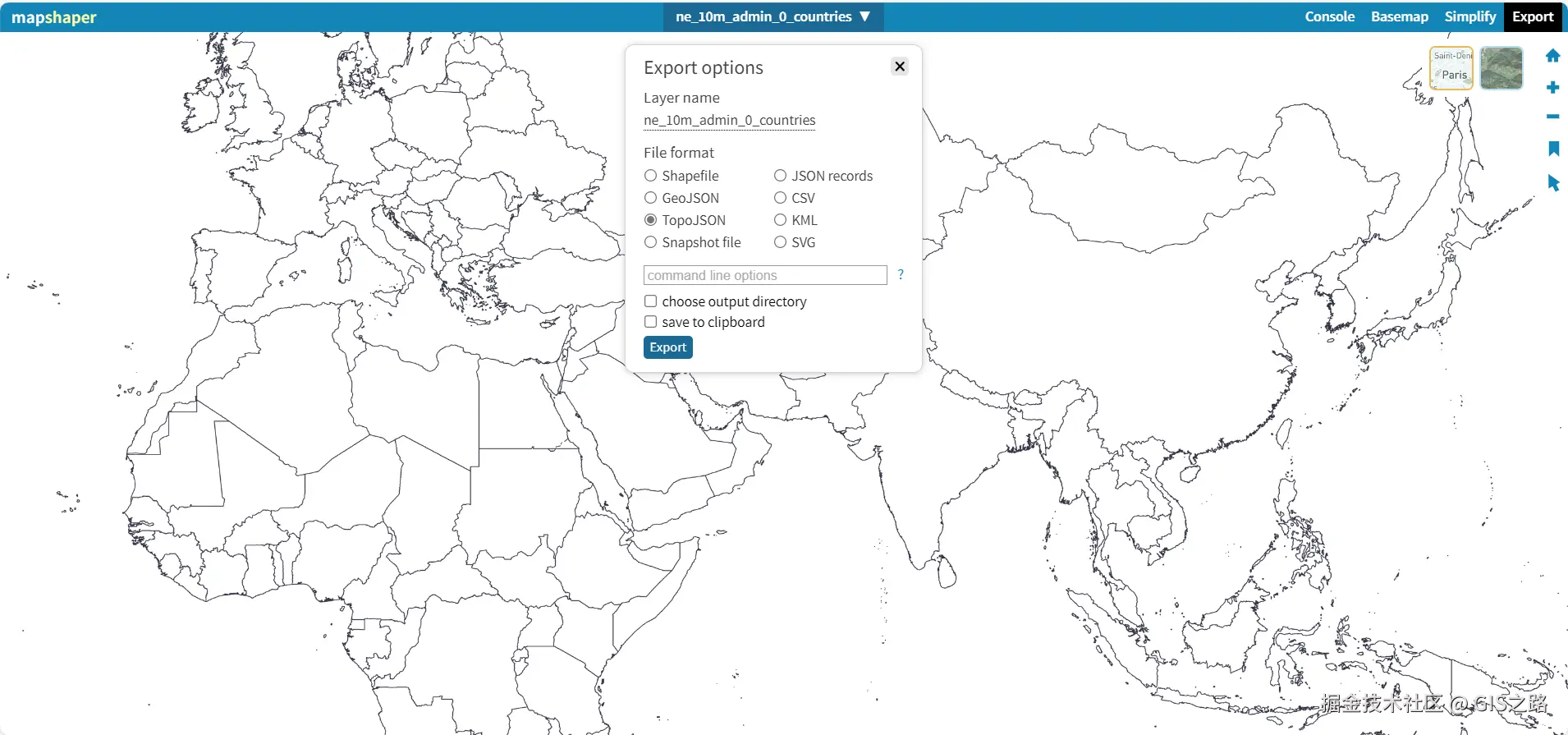 地址:[https://mapshaper.org/](https://mapshaper.org/)一个在线工具,支持将GeoJSON与TopoJSON数据的互相转换(GeoJSON转换为TopoJSON:上传GeoJSON文件数据,选择导出模式为TopoJSON;TopoJSON转换为GeoJSON:上传TopoJSON文件数据,选择导出模式为GeoJSON),并提供数据简化功能。该工具无直接下载功能,但支持将各种常见的GIS矢量数据格式上传,然后选择目标导出格式进行下载。