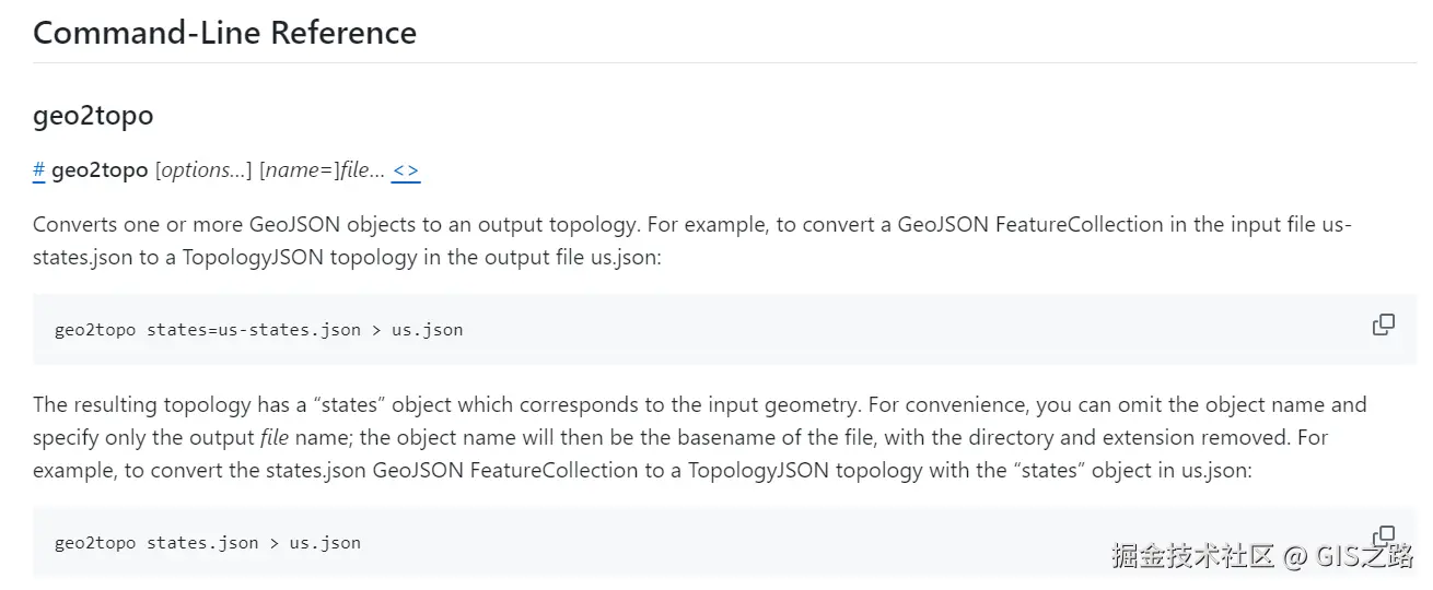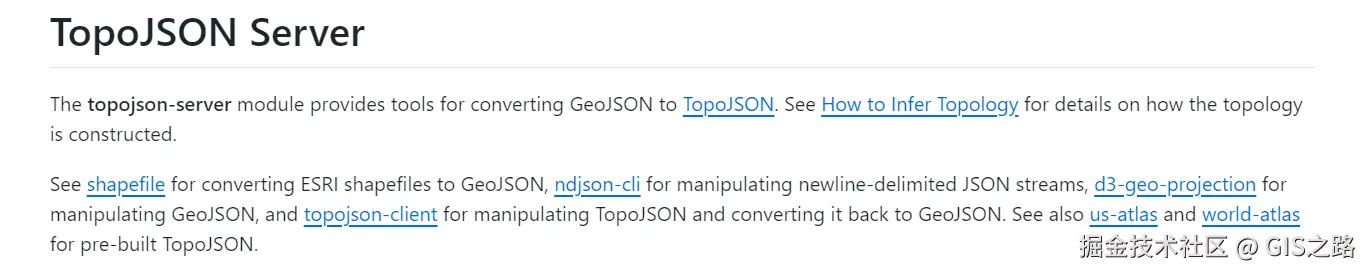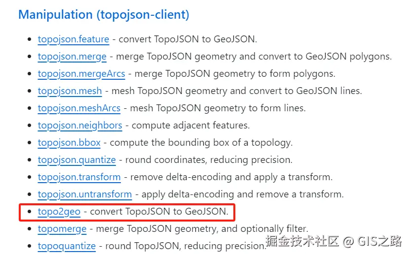 - 使用topo2geo工具可以将TopoJSON转换为GeoJSON。