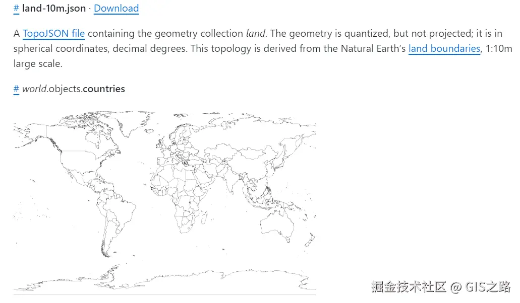 下载地址:[https://github.com/topojson/world-atlas](https://github.com/topojson/world-atlas)该地址提供全球范围的TopoJSON数据,包括国家、海洋和河流等。以下是数据样例和截图。