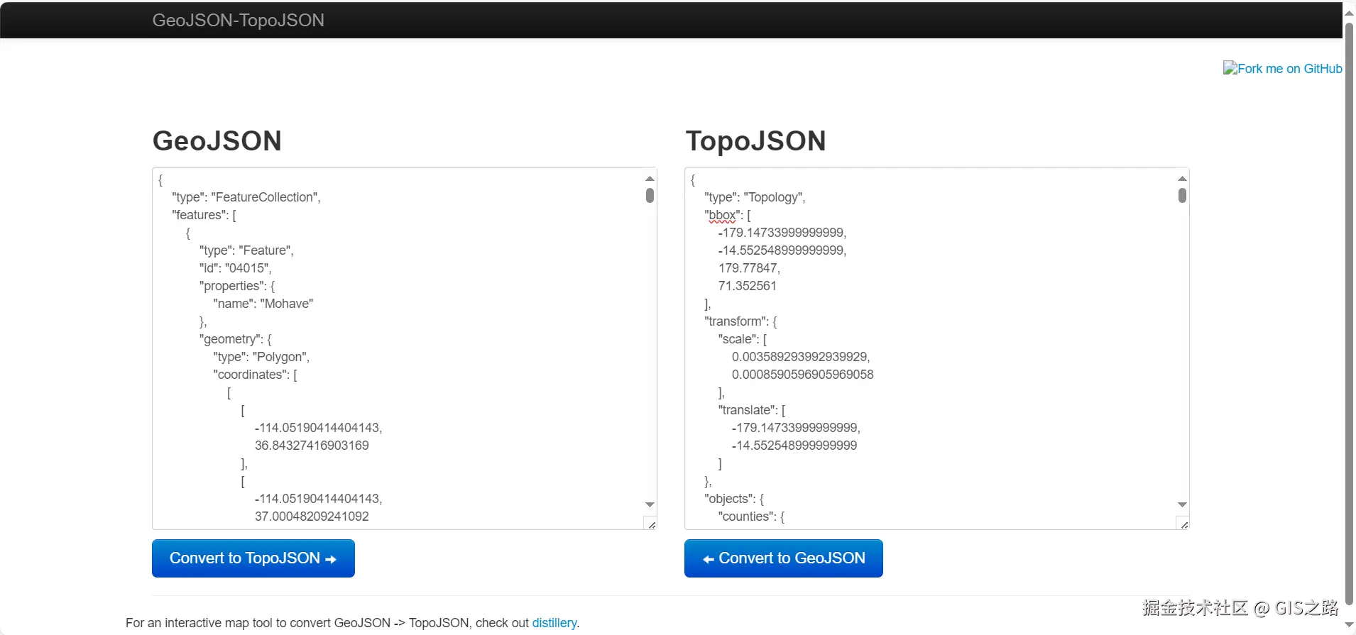 在线地址:[https://jeffpaine.github.io/geojson-topojson](https://jeffpaine.github.io/geojson-topojson/)网站提供GeoJSON数据和TopoJSON数据互相转换功能。