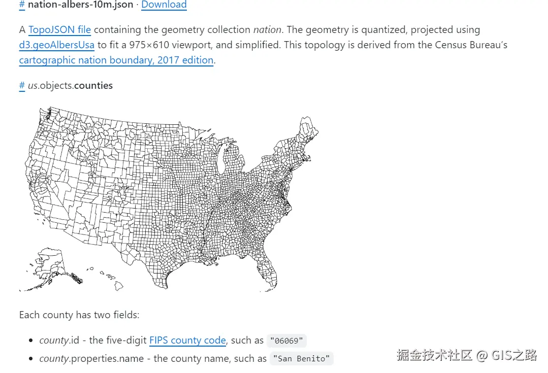 下载地址:[https://github.com/topojson/us-atlas](https://github.com/topojson/us-atlas)该地址提供美国各州、县的TopoJSON数据下载,包括州界、县界以及城市。