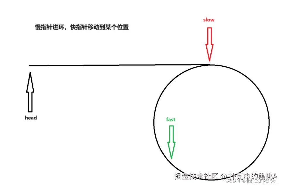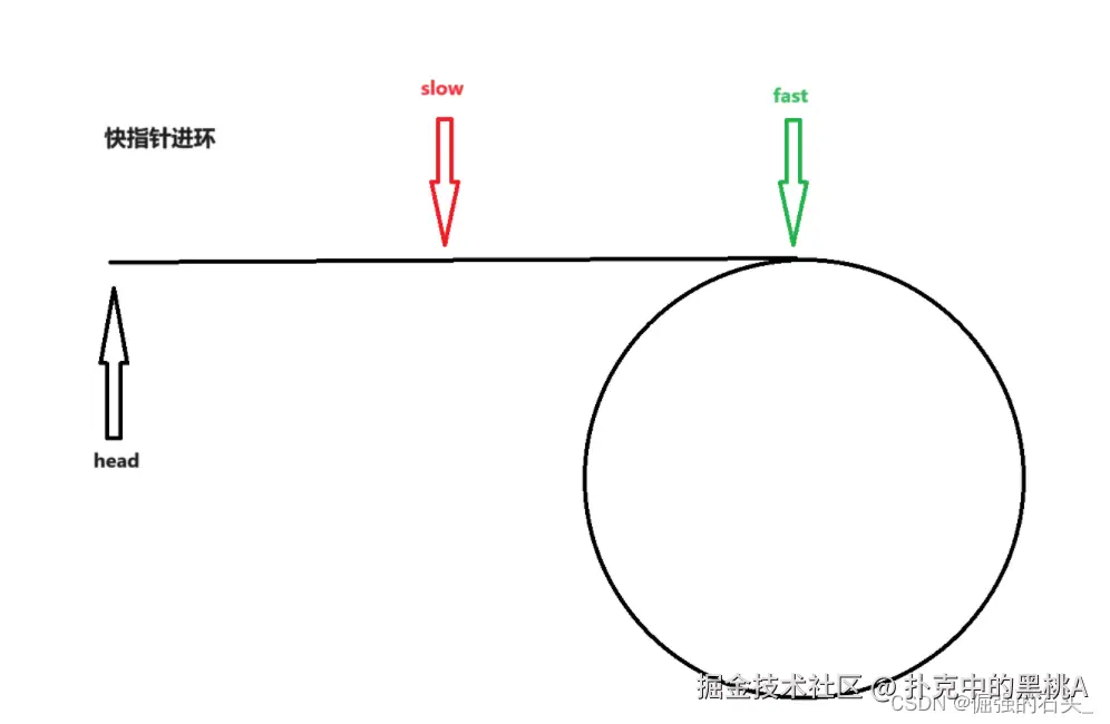 继续走,当慢指针进环时,快指针已经在环中走了一段时间;