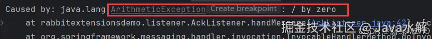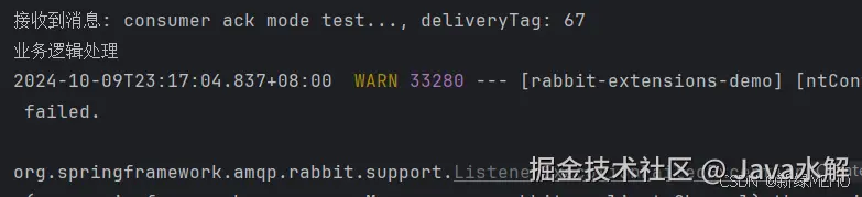 此时我们可以看到,消息虽然被消费者收到了,但是因为消费时发生异常导致消息没有被正常消费,而且队列中的消息也已经没有了。