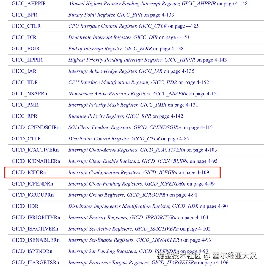 GICD_ICFGRs为GIC支持的每个中断提供一个2位配置字段。此字段标识相应的中断是边缘触发的还是电平触发的