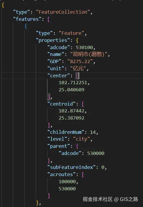 在进行数据标注前,需要准备相应的地图数据,在本文中以GeoJSON数据为例进行讲解。通过下载云南省行政区范围GeoJSON数据,然后将云南省16个州市的GDP数据写入属性信息中进行展示。数据结构如下。