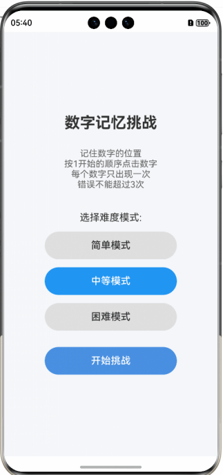 数字记忆挑战游戏的设计灵感来源于经典的记忆训练方法,通过让用户在有限时间内记忆数字的位置并按顺序点击来锻炼短期记忆能力。游戏遵循"循序渐进"的原则,设计了三种不同难度模式,满足不同年龄段和记忆水平用户的需求: