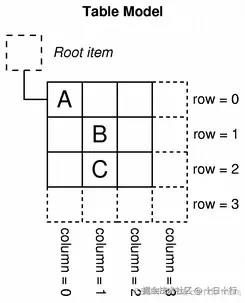 该图显示了一个基本表模型的表示,其中每个项目通过一对行号和列号定位。通过将相关的行号和列号传递给模型,我们获得一个引用数据项的模型索引。