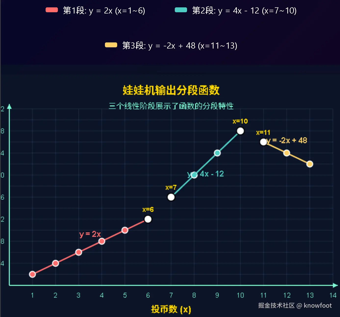 可当投入 11 枚硬币时,输出的娃娃数变成了 26 个,开始递减,机器的变化还在继续。琪琪再次努力拟合这组新数据,得出公式 y = -2x + 48 。她惊叹道:“原来这台机器不是遵循一条直线规律,而是由三段不同的线拼接起来的!” 她将整段输入输出情况画在图上,清晰地标注出:第 1 段,y = 2x (x = 16);第 2 段,y = 4x - 12 (x = 710);第 3 段,y = -2x + 48 (x = 11~13) 。如图: