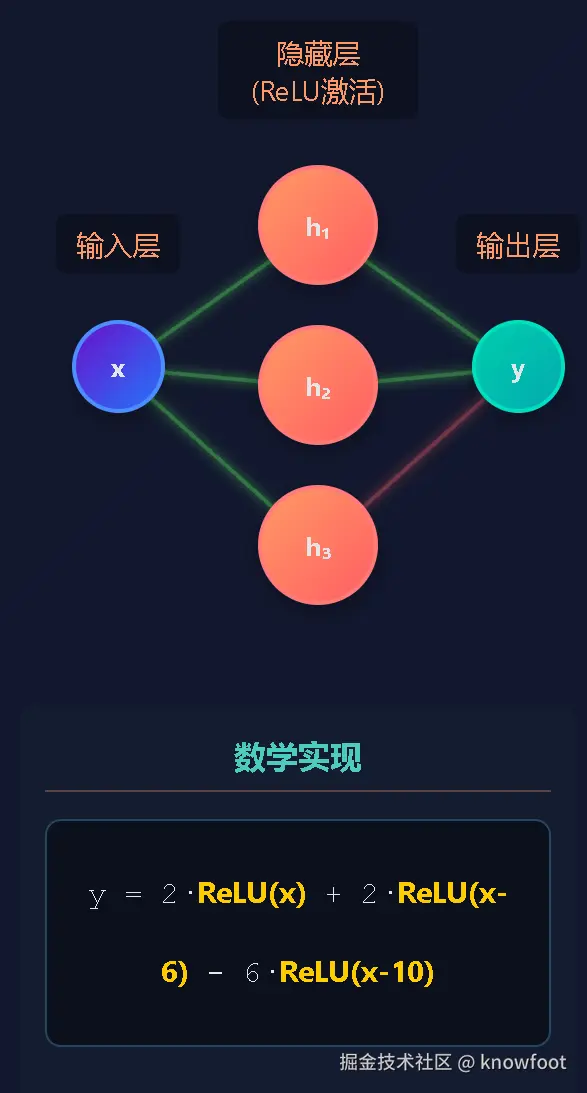 面对这复杂的分段规律,琪琪不禁思考:“这些分段的线性规律,能不能用一个统一的方式建模出来呢?” 她想起学过的 “神经网络”,其中有一种结构叫多层感知机(MLP) 。多层感知机的工作方式是,每一层先进行线性变换 Wx + b,接着接上一个非线性函数比如 ReLU(z) = max(0, z),ReLU函数在输入大于0时返回输入值,小于等于0时返回0。然后多层组合起来,就能表达出复杂的非线性函数。琪琪决定尝试用多层感知机来学习机器的输入输出关系。一个简单的三段函数,可以通过如下的神经网络结构实现:输入 x 经过第一层线性变换,再经过 ReLU 激活函数,最后通过第二层线性组合,得到输出 y 。每一个线性变换能够学习一段直线,ReLU 则控制在哪一段激活。这些部分巧妙组合起来,就能近似拟合多段线性函数。如图: