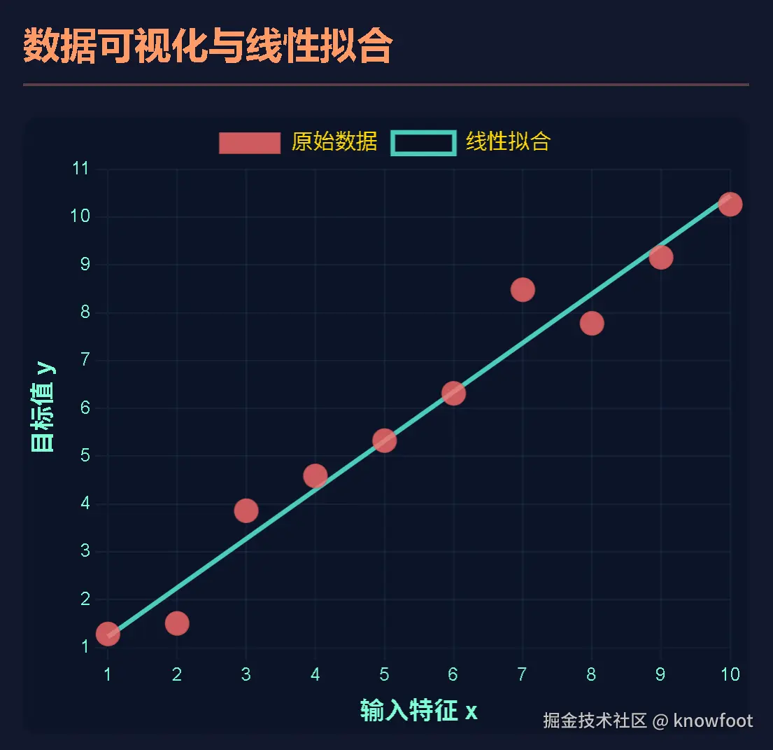 前面的琪琪遇到线性关系是理想情况,现实中的映射关系在局部都不会是理想的线性关系,那我们如何写出局部近似线性关系线性方程了,这里我们介绍的一种最简单的算法,通过最小化平方损失函数(在几何上体现的就是欧式几何中的举例最小),也就是最小二乘法的标准方法来实现线性回归,在近似线性的数据中找到最佳拟合线性方程。效果如下图: