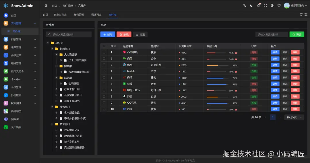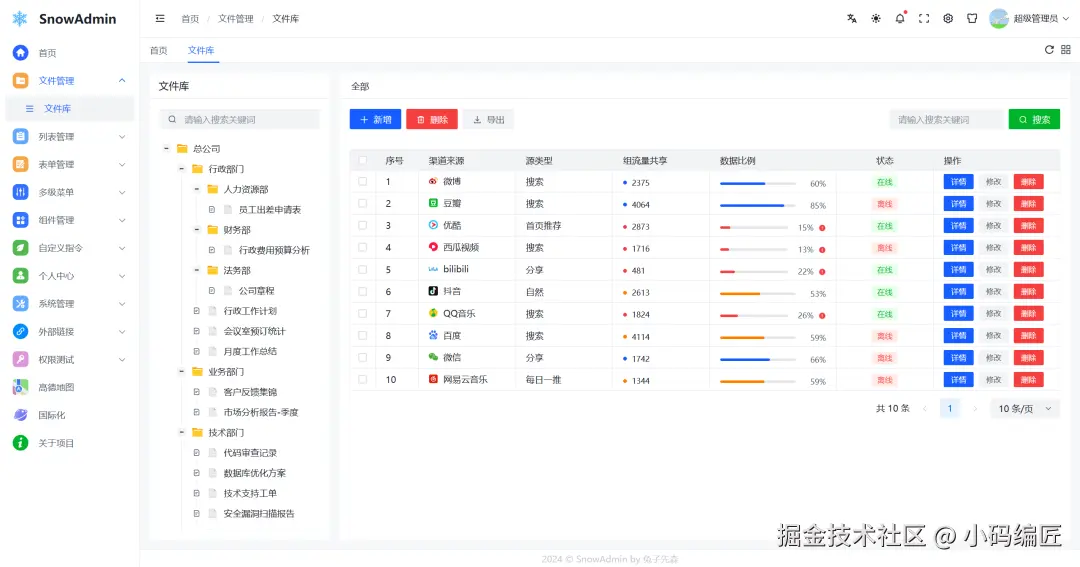 SnowAdmin是一款基于 Vue3、TypeScript、Vite5、Pinia 和 Arco-Design 的开源后台管理框架。它不仅具备清新优雅的 UI 设计和强大的功能模块,还提供了一站式的后台管理解决方案。不管是企业内部管理系统、电商平台后台,还是内容管理系统(CMS)和客户关系管理系统(CRM),SnowAdmin 都能胜任。