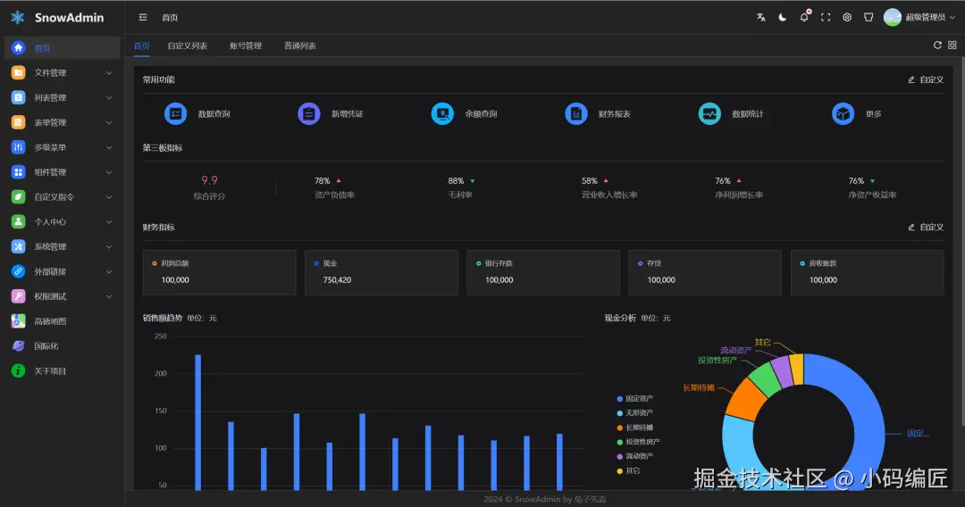 在Web开发中,后台管理系统作为企业级应用的核心部分,其开发效率与系统稳定性至关重要。随着前端技术的不断发展,Vue3、TypeScript、Vite5等新技术的出现为开发者提供了更高效的工具链支持。为了帮助大家快速开发功能完善、界面美观的后台管理系统,SnowAdmin应运而生。