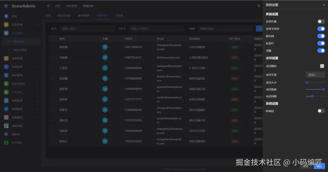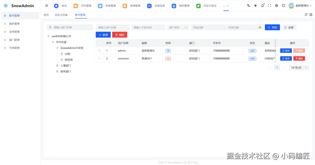 SnowAdmin 提供了多个核心功能模块,涵盖常见的后台管理需求: