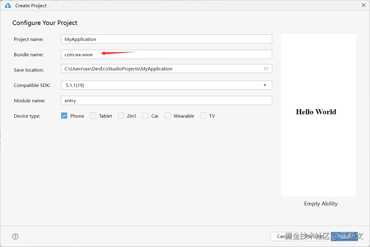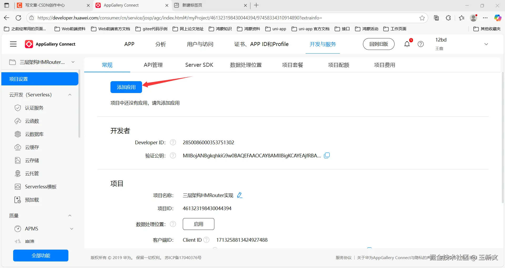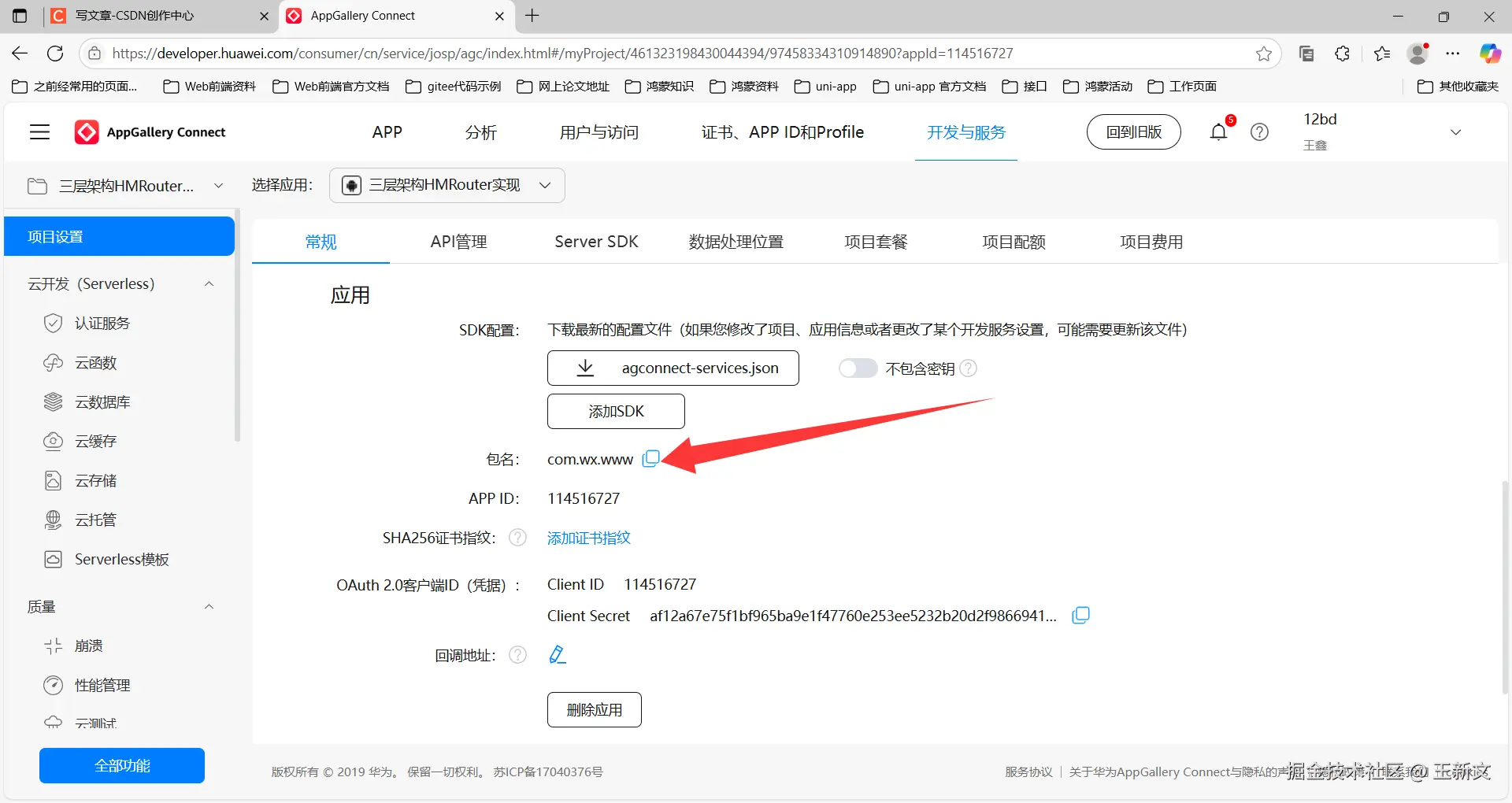 将复制的包名放在如下位置,将应用与AGC控制形成联系,方便后续申请权限。点击Finish