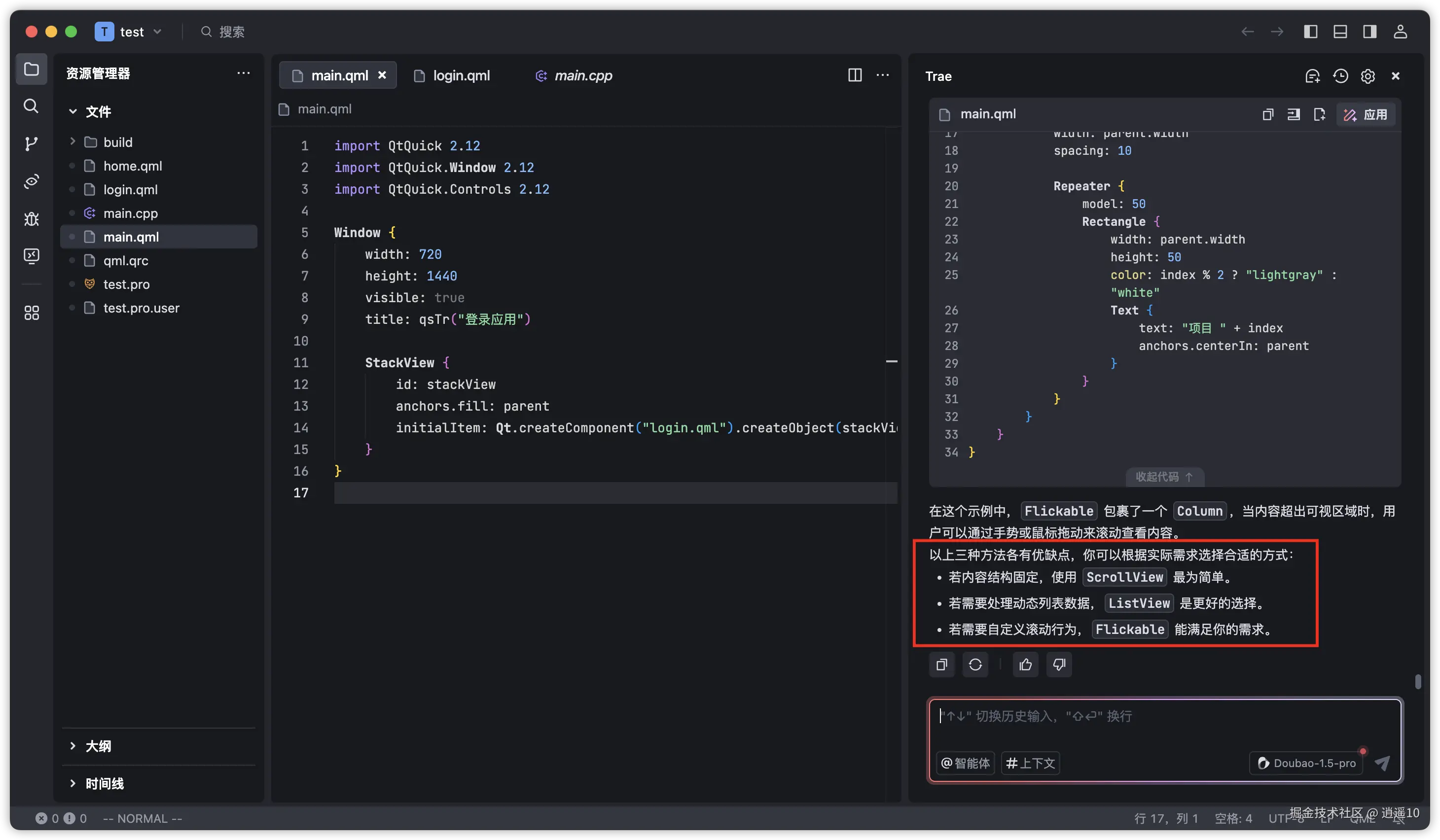 很多时候内容会超过一屏的高度,这个时候可以采用ScrollView、ListView来使得内容滚动显示,我们来问一下trae,直接介绍了三种,包含我上面说的两种方式:二、滚动显示