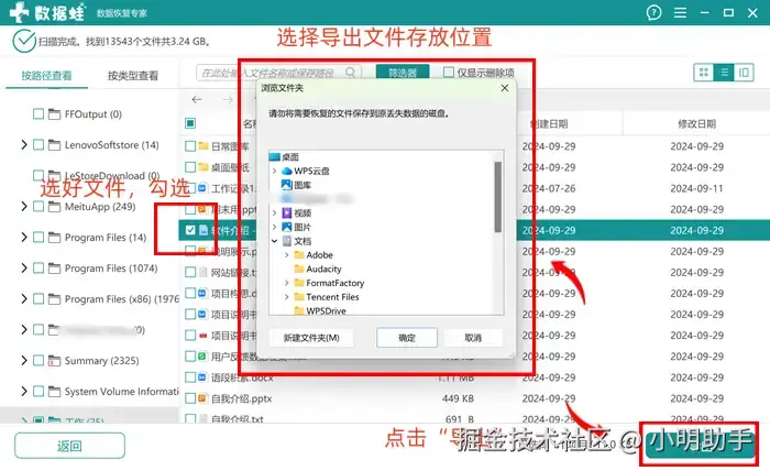 步骤2: 在软件按类别或按位置进行归类的文件中选择出自己需要恢复的文件,选择后点击“导出”;最后在弹窗中选择目标文件新的存放位置。