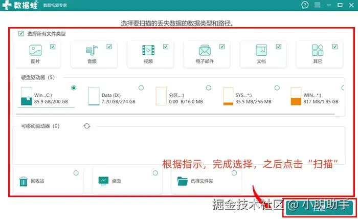 步骤1: 在电脑中打开这款软件,根据提示我们需要完成文件类型和扫描位置的选择,最后选择“扫描”;