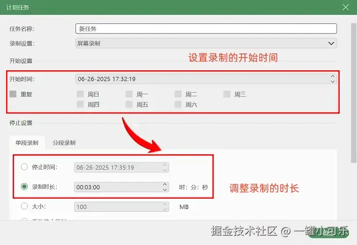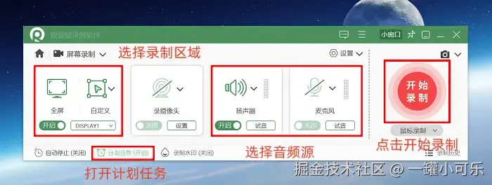 步骤2:接着可以调整一下录制的参数,比如录制的屏幕区域、音频源等。如果你是固定时间的需要录制,还可以开启 “计划录制任务” 。设置好了之后,点击 “录制” 按钮就可以开始录制视频了。