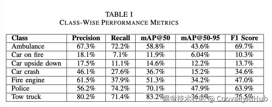 表I详细列出了各类别的性能指标,包括精确率、召回率、mAP@0.5、mAP@0.5:0.95和F1分数。拖车类别表现最优,获得80.2%精确率、71.4%召回率和83.2%的mAP@0.5值,表明具有显著特征的大尺寸目标更易检测。救护车、警车和消防车因独特外形色彩及充足样本量同样表现良好。