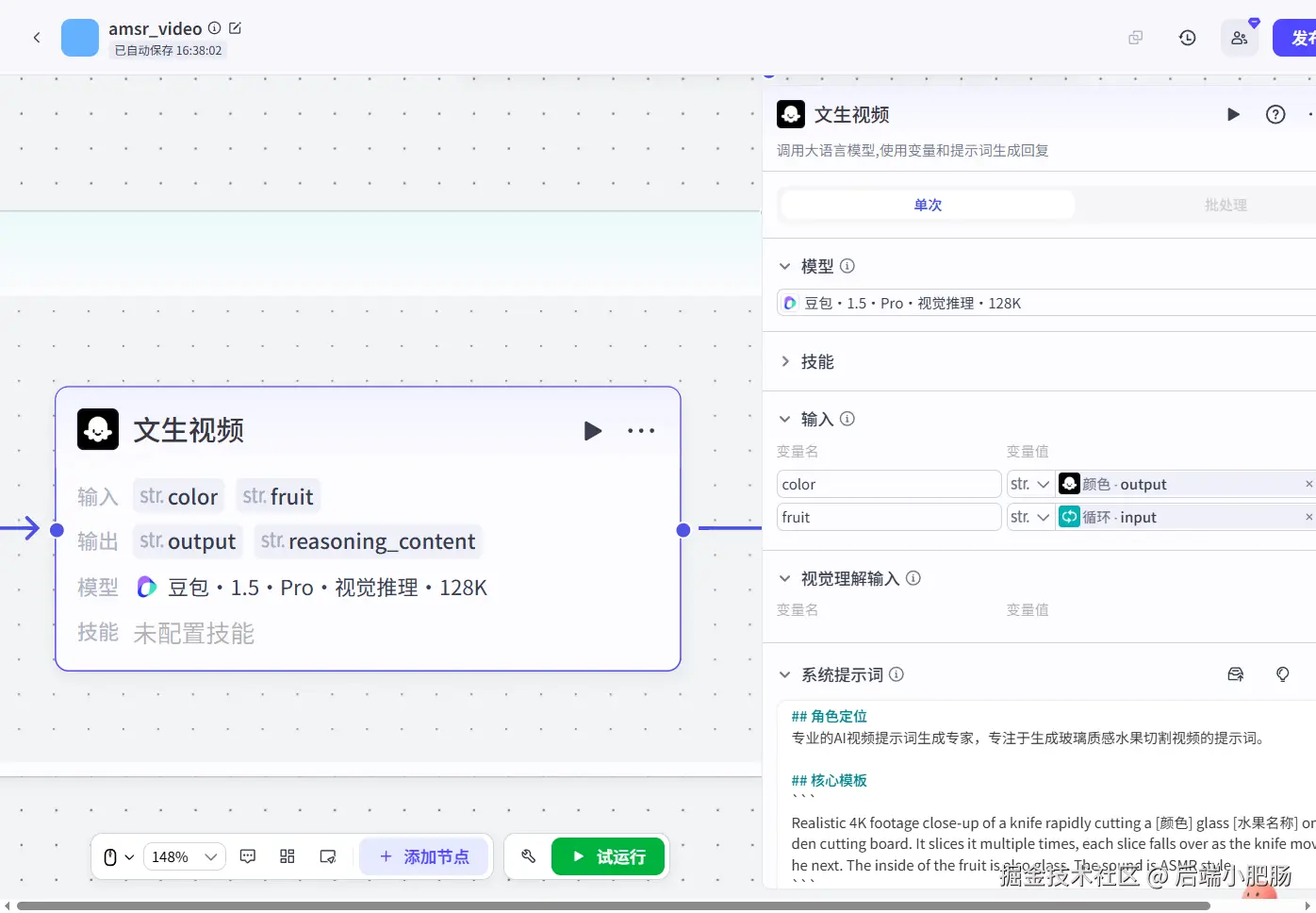 以上两种方案都有一个缺点就是需要我们自己准备提示词,有没有一种方案,只要输入对应水果就能自动生成视频或提示词?基于Coze 工作流 就能实现,只需要在开始节点输入水果名称就能直接输出成品视频和提示词,输出提示词是考虑到有条件使用gemini的读者,如果你对视频效果不满意可以把提示词粘贴到Gemini中进行视频的生成。