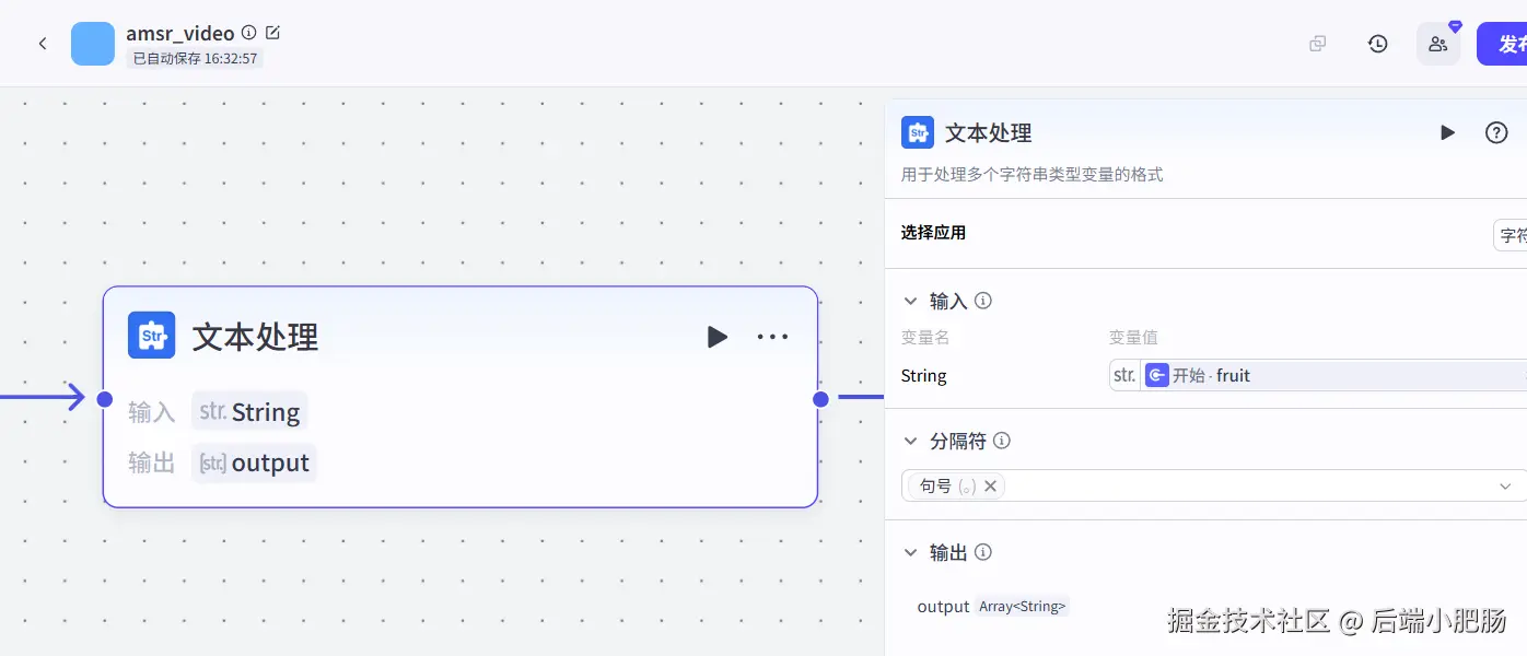 文本处理: 这个节点的作用是基于逗号分割水果名称,输出为字符串数组。