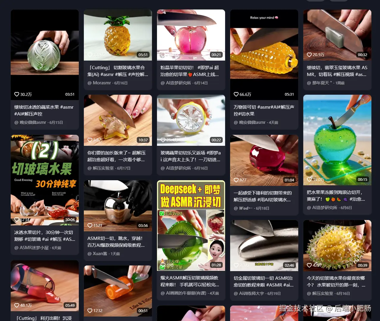 最近AI 切水果 在短视频平台热度爆棚,在抖音、小红书等平台上,这类视频如雨后春笋般涌现,单条视频轻松收获几十万点赞,玻璃水果、宇宙水果等创意层出不穷。从科技达人展示 AI 创作过程,到普通用户跟风发布自制视频,AI 切水果已然成为全民参与的创作热潮,凭借超现实的视觉效果与沉浸式的 ASMR 音效,稳稳霸占各大平台的推荐首页。