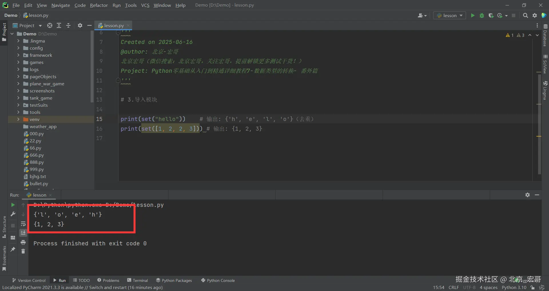 - 用途:将可迭代对象转换为集合(去除重复元素)。