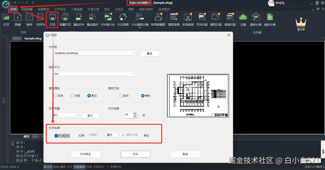 点击CAD看图王的文件菜单栏的打印功能。在出来的打印框中,进行打印设置。