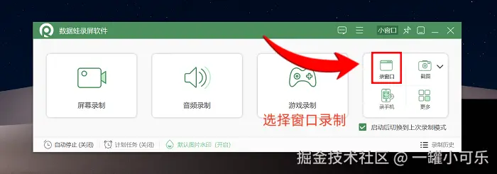 步骤1:打开软件后,你会看到一个清晰的主页面,上面各种录制模式和功能选项都一目了然。我们先讲解一下 “窗口录制” 模式。
