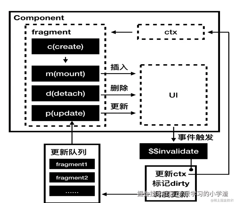 核心思想:通过静态编译减少框架运行时的代码量。也就是说,vue 和 react 这类传统的框架,都必须引入运行时 (runtime) 代码,用于虚拟dom、diff 算法。Svelte完全溶入JavaScript,应用所有需要的运行时代码都包含在bundle.js里面了,除了引入这个组件本身,不需要再额外引入一个运行代码。