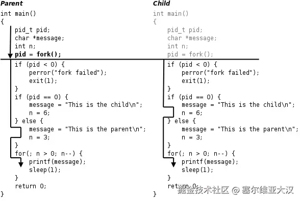fork函数的特点概括起来就是“调用一次,返回两次”,在父进程中调用一次,在父进程和子进程中各返回一次。从上图可以看出,一开始是一个控制流程,调用fork之后发生了分叉,变成两个控制流程,这也就是“fork”(分叉)这个名字的由来了。