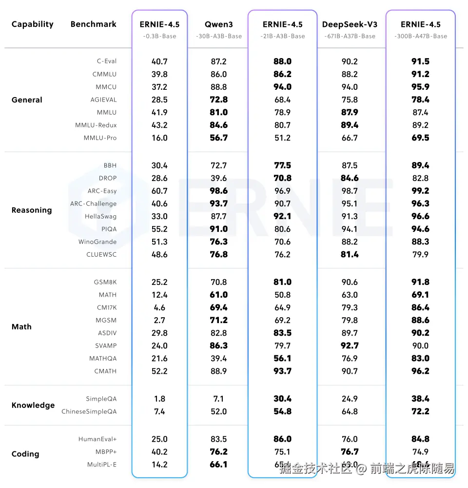 在文本模型方面,文心 4.5 开源系列基础能力强、事实准确性高、指令遵循能力强、推理和编程能力出色,在多个主流基准评测中均有优秀表现。