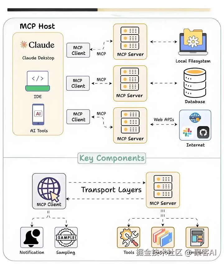传输层 (Transports): 规定怎么“递纸条”。最常见的是走HTTP接口(就像网页请求),当然也能用WebSockets(实时聊天)或者标准输入输出(命令行)。
