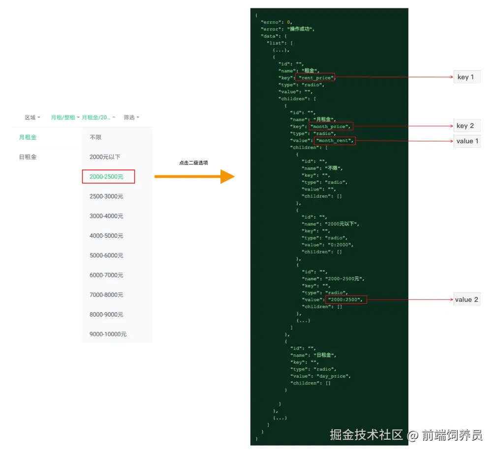 当点击【租金】下【月租金】且选择【月租金】下【2000-2500 元】选项时,对应的数据结构如右图 [key1] 对应取 [value1] 的值,[key2] 对应取 [value2] 的值,均取其子选项值,最终得到的数据格式如下: